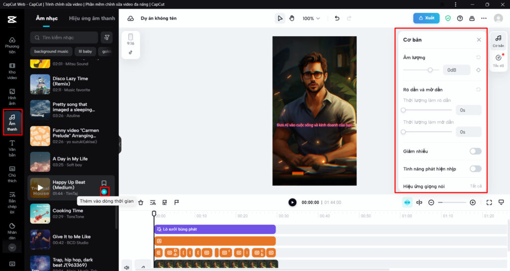 Ace có thể lựa chọn thêm âm thanh nền cho Video nếu muốn, tùy chỉnh âm lượng và các điều chỉnh khác