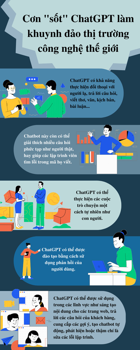 - ChatGPT là một chatbot mô hình ngôn ngữ lớn có khả năng tạo sinh được phát triển bởi OpenAI. Nó lần đầu tiên được công bố vào tháng 11 năm 2022 và nhanh chóng trở nên phổ biến do khả năng tạo ra cuộc trò chuyện thực tế và mạch lạc.